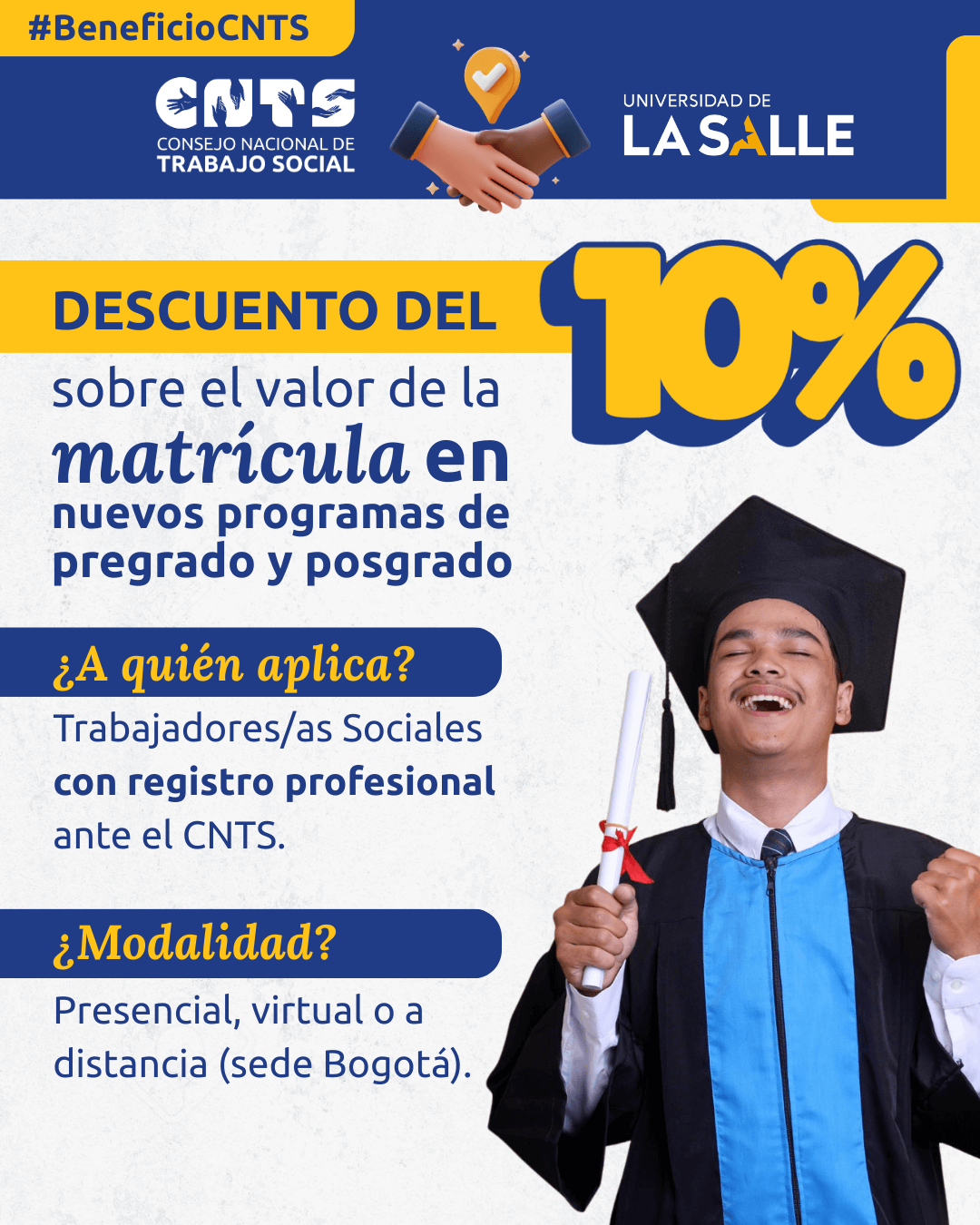 El Consejo Nacional de Trabajo Social y la Universidad de La Salle establecen la ejecución del 10% de descuento sobre el valor de la matrícula a los programas de pregrado y posgrado (especialización, maestrías y doctorados) ofrecidos en la sede de Bogotá en la modalidad presencial, virtual o a distancia. Dirigido a los Trabajadores Sociales asociados, colaboradores y funcionarios, sus cónyuges o compañeros permanentes, y/o parientes en el primer grado de consanguinidad del Consejo Nacional de Trabajo Social.